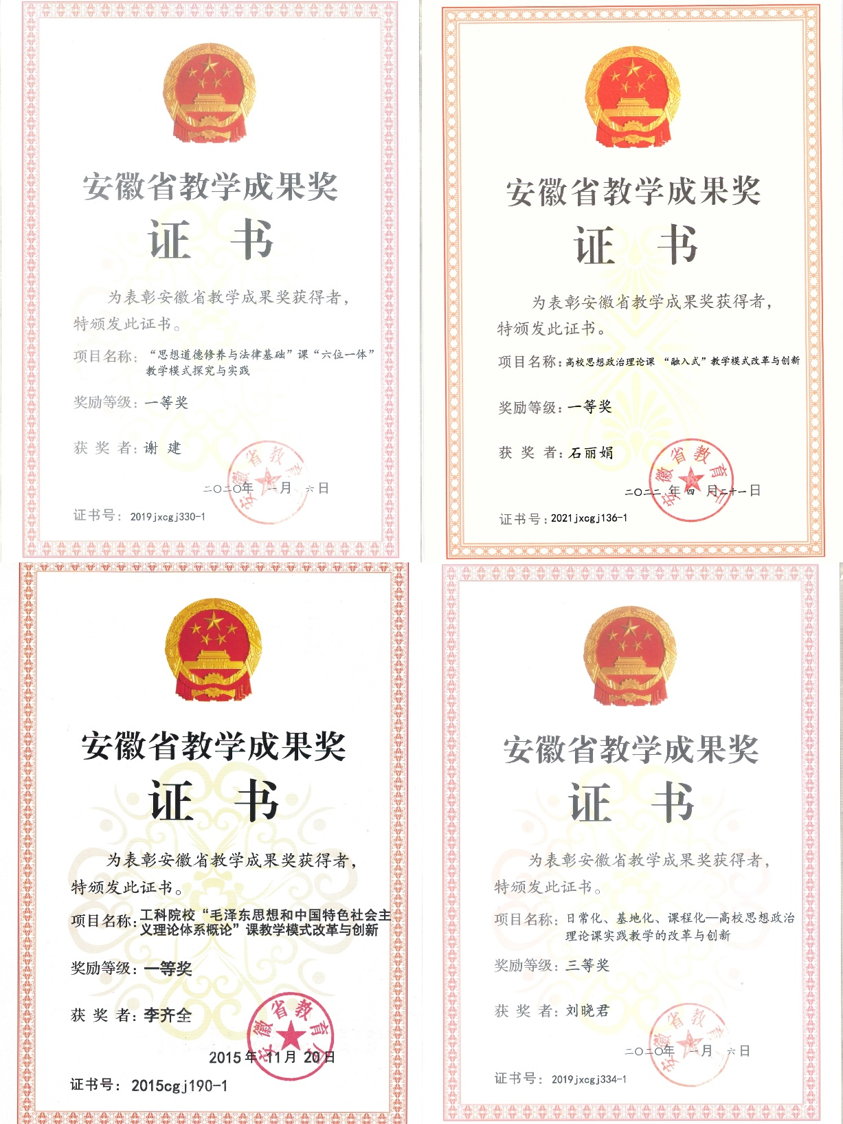 强化教学研究,构建以研促教的教学支撑体系。学院教师围绕“习近平新时代中国特色社会主义思想融入思政课教学”“思政课教学改革创新”“思政课程与课程思政”等方面开展教学研究,及时将研究成果运用于教学工作中,促进教学水平不断提升。学院先后获批教育部思政专项、省级质量工程等项目30余项,获安徽省高等教育教学成果一等奖2项、二等奖、三等奖各1项。1名教师获批省级教学名师,1名教师获省高校思想政治理论课教师度影响力人物,4名教师获省级教坛新秀。获安徽省普通高校青年教师讲课竞赛二等奖、省高校党史说课比赛一等奖、省高校教学创新比赛二等奖等奖项10余项。