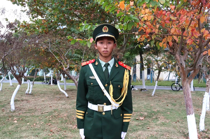 谈到如何看待自己担任国旗护卫队举旗手这一使命,刘星灿同学说每当他拿起国旗时,尽管只是小小的一角,但是他不敢有些许的懈怠,生怕因为自己的失误,而让国旗滑落或是有了皱褶。在他心目中,国旗重于泰山,自己的使命就是护卫好国旗。他必须把每一次训练都看作一场战斗来对待,当他持旗时,他心中并不只有国旗那轻盈的一角,更有那抹红色所传递的厚重使命感与责任感。