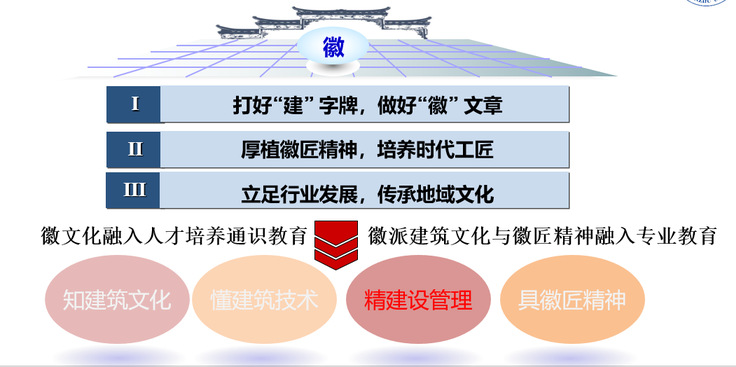 学校发挥优势学科的引领作用,被誉为“皖江建筑人才的摇篮”,实施新兴学科群培育工程,推进学科交叉、错位发展。工程管理作为特色专业,一直得到学校的重点支持,历经近三十届办学实践,始终坚持工程教育理念,传承徽文化,注重塑造徽匠品质,不断铸造形成“思政引领、数智赋能、徽匠传承、多维融合、产教协同”五位一体的人才培养模式。专业教育基础扎实,拥有优秀的双师型教学科研团队和现代化专业实验实训中心,建有一批优质的校外实践基地,学生能够受到系统的工程基础教育和工程师的基本训练,获得良好的学习条件。