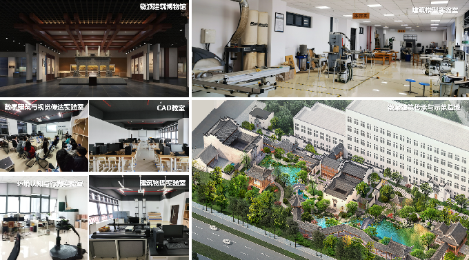 设有专用展厅全面展示学院各专业的作业、教学、科研成果以及国内外合作交流、校园文化等;利用走道、南北连廊、作业展厅作为学生作业展示和评阅空间;CAD教室、美术画室用于建筑相关软件教学和美术教学;学术报告厅、多媒体教室等,开展学术活动、理论教学等;专用的扫描复印室、图档室,保存学生作业;合用的建筑图书分馆,构造模型技术展厅用于学生学习先进的前沿专业知识。有建筑设计院、规划设计院、省级科研平台等实践平台用于学生实习与实践训练,另有徽派博物馆及徽派建筑传承与示范基地,专门用于学生学习及研究地域建筑及徽州文化。