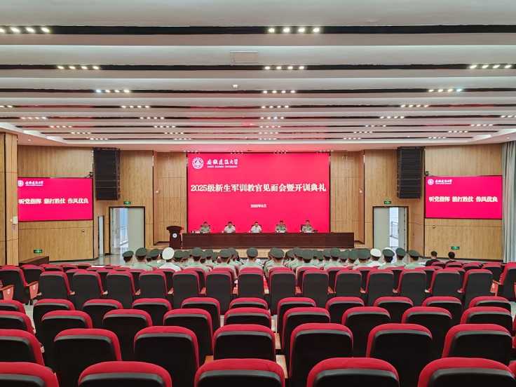 本网讯 9月13日上午,2025级新生军训教官见面会暨开训典礼在紫云路校区徽风楼2楼报告厅召开。校党委常委、副校长高跃峰出席会议并发表讲话,校人武部负责人、中国人民解放军某院校官兵以及各学院分管学生工作的书记共同参加。