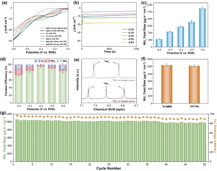 研究团队采用定点激光辐照技术,构建了空间上分离的功能催化界面:hcp-Co/fcc-Co异质结有效促进NO3-的高效脱氧,而Ag/hcp-Co界面则加速NO2-的质子化反应动力学。原位光谱分析与差分电化学质谱(DEMS)结果共同验证了*NO2中间体在不同活性位点间的穿梭机制。密度泛函理论(DFT)计算进一步表明,界面处的电荷重新分布(1.74个电子从Co向Ag转移)显著降低了决速步骤(NO→*NOH)的能垒至0.25 eV,同时有效抑制了析氢反应的发生。