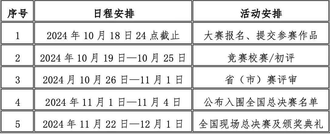 2024年整体赛事工作部署,赛程分为:校级初赛、省(市)赛评审全国总决赛三个阶段;各赛程设置及具体安排详见附件《竞赛指南》。